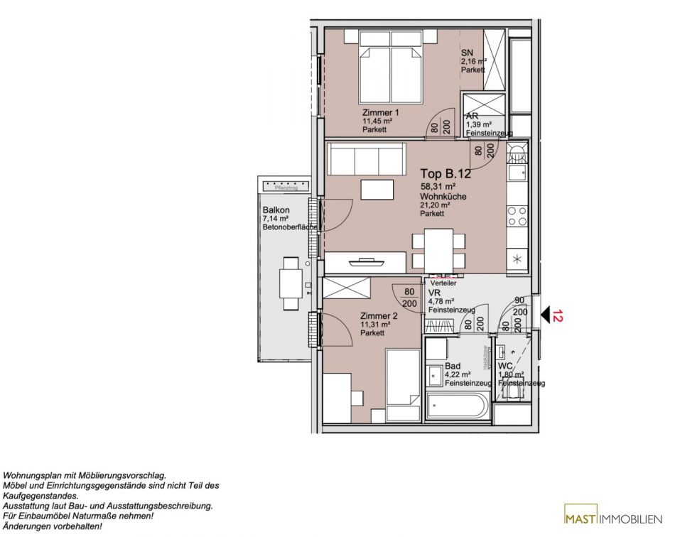 Die Wohnung befindet sich im 2. Liftstock und verfügt über 58,31 m² Wohnfläche + einen 7,14 m² großen Balkon.