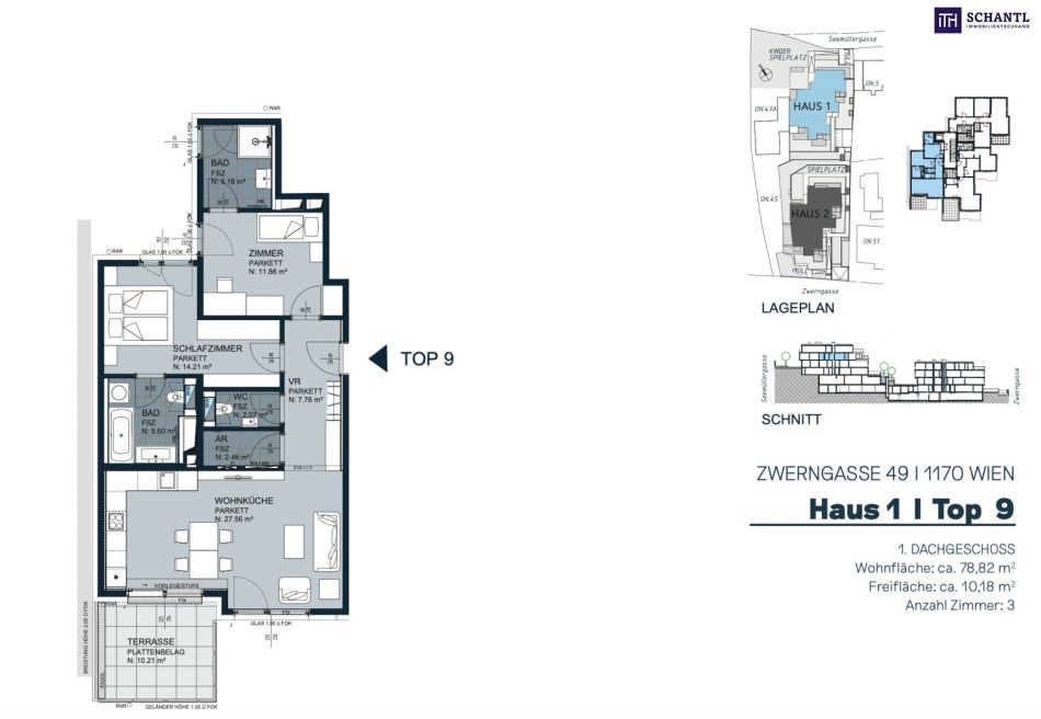 Diese hochwertig ausgestattete 3-Zimmer-Dachgeschosswohnung vereint architektonische Raffinesse mit Wohnkomfort auf höchstem Niveau. Große Fensterflächen, eine sonnige Terrasse mit über 10 m², zwei vollwertige Badezimmer und eine elegante Ausstattung machen Top 9 zu einem der exklusivsten Angebote in der Zwerngasse.