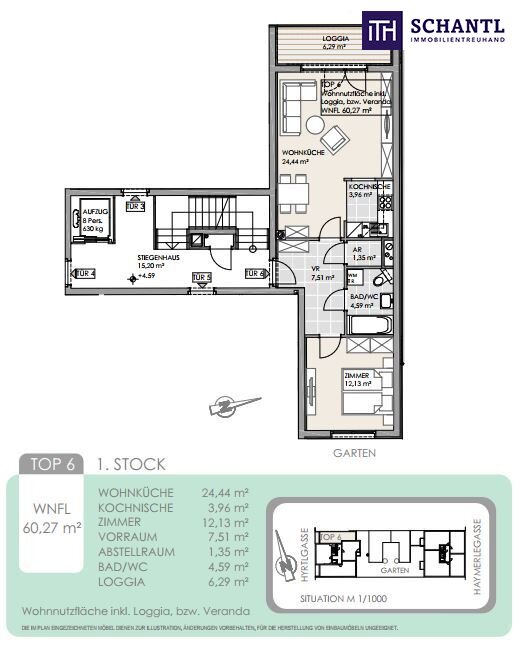 Wohnfläche: ca. 60,27m² + Loggia: ca. 6,29m² + Kellerabteil + Garagenabteil optional