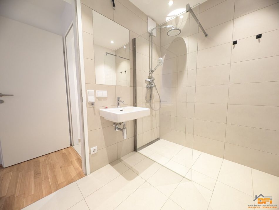 - Badezimmer mit Dusche und Waschmaschinenanschluss