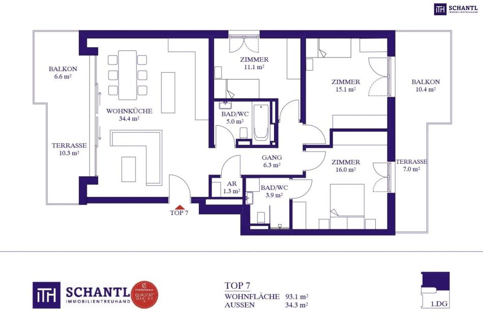 Wohnfläche: ca. 93,1 m² + Terrasse: ca. 17,3 m² + Balkon: ca. 17 m² + Kellerabteil