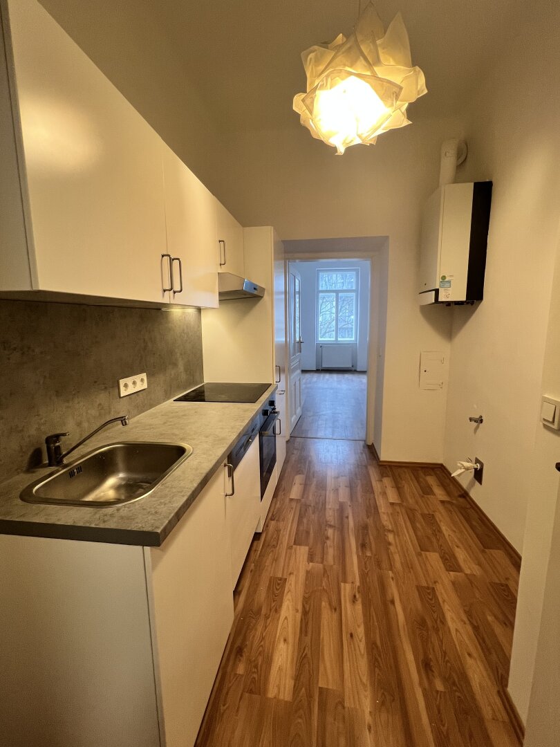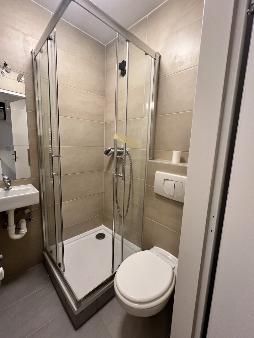 Sie betreten die Wohnung und gelangen direkt in die Küche gelangen. Danach betreten Sie von der Küche aus in das Wohn/Schlafzimmer, sowie das separate WC und das Duschbad.