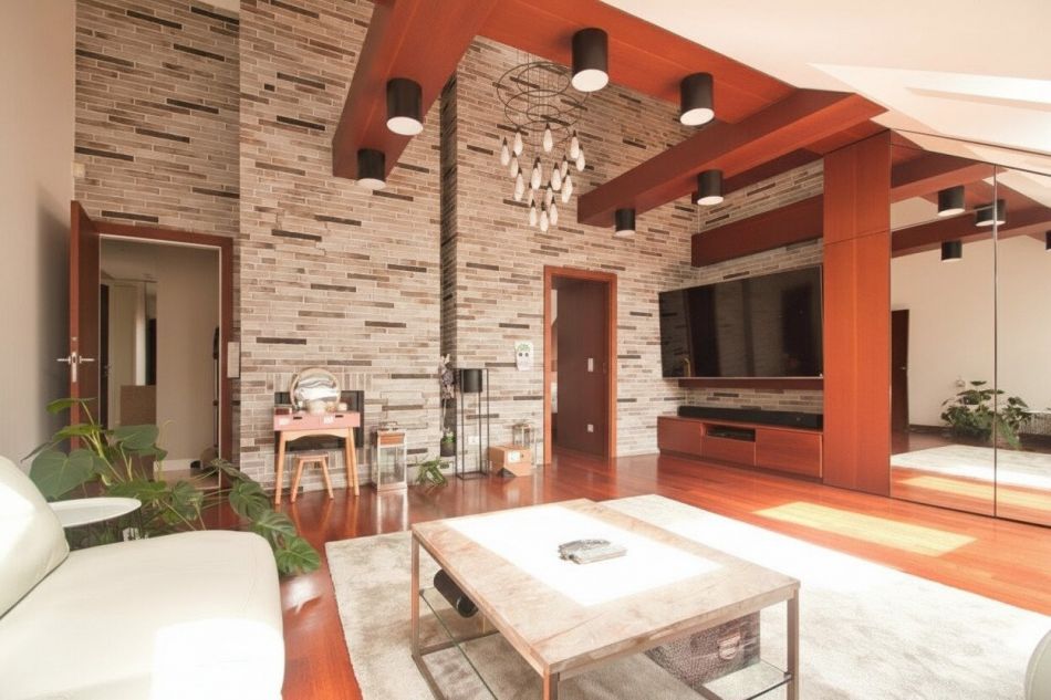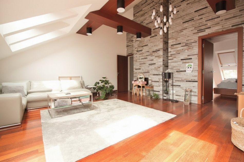 Vom Vorraum gelangt man weiter in das ca. 35 m² große und äußerst beeindruckende Wohnzimmer. Das Wohnzimmer ist südseitig ausgerichtet und mit bis zu 4,3 m Raumhöhe und dem offenen Kamin ein absolutes Highlight. Die 5 Dachflächenfenster sorgen für eine besondere Lichtstimmung. Die einzigartigen Balken und die Beleuchtung bieten einen unnachahmlichen Charme und bringen viel Gemütlichkeit in den besonderen Raum.