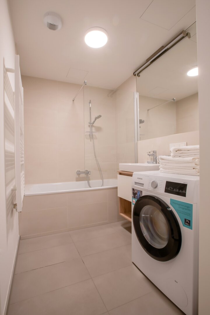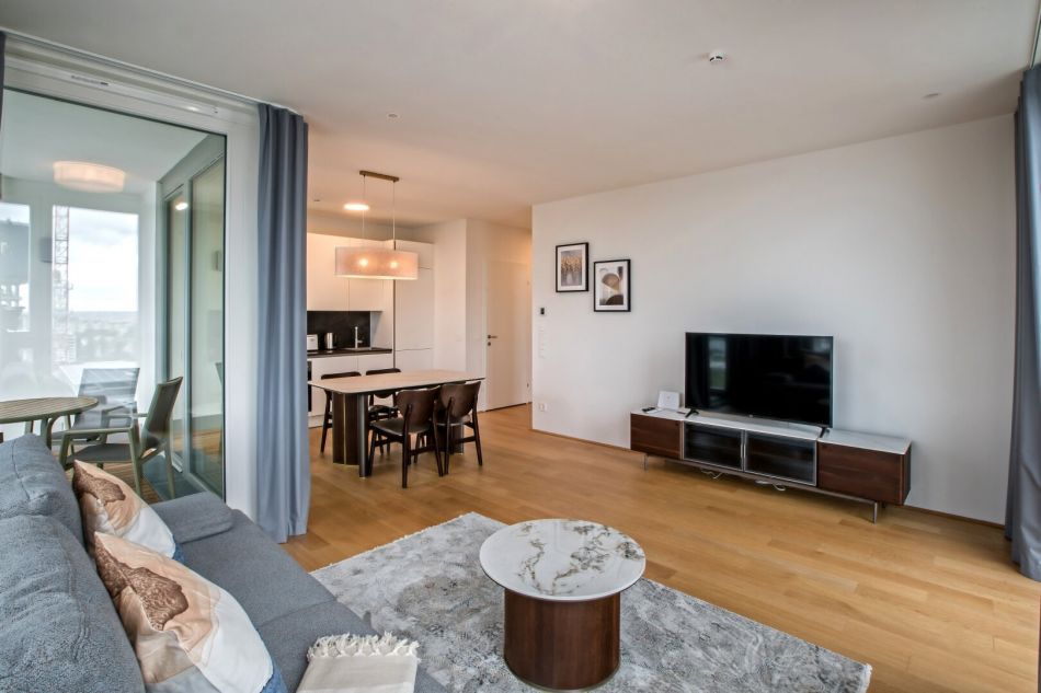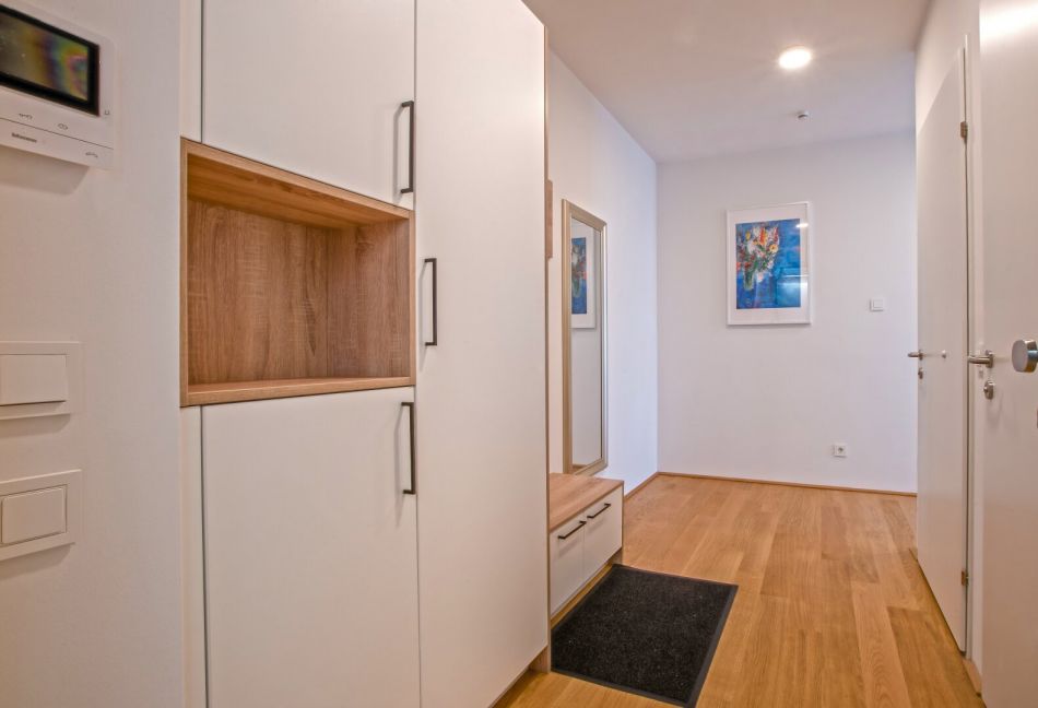 Über den Vorraum gelangt man in die Wohnung, wo man über den Flur sämtliche Räumlichkeiten zentral begehen kann. Die beeindruckende Wohnung verfügt über ein Badezimmer mit Waschbecken, Handtuchtrockner, Badewanne mit Glasduschwand & Waschmaschine. Ein separates WC mit Handwaschbecken befindet sich direkt neben dem Badezimmer. Das helle Wohnzimmer samt hochwertiger Einbauküche bietet zudem Zugang auf die Loggia mit Ausblick über Wien. Ein Abstellraum ergänzt das Raumangebot hervorragend.