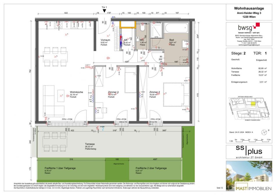 *Während der Aktion werden die Verkaufspreise um 6,5 % reduziert. Dies entspricht den durchschnittlichen Nebenkosten beim provisionsfreien Wohnungskauf (1,9 % Vertrags-errichtung, 3,5 % Grunderwerbsteuer, 1,1 % Eintragungsgebühr). Die auf Basis des um 6,5% reduzierten Kaufpreises berechneten Nebenkosten sind über den Treuhänder zu begleichen. Eine mögliche Gebührenbefreiung gem. § 25a iVm § 25b Gerichtsgebührengesetz kann zusätzlich in Anspruch genommen werden.
