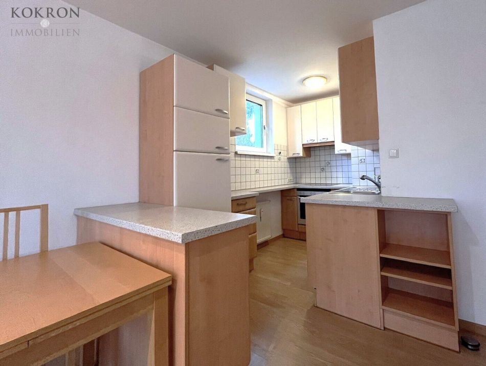 Die Küche (mit Fenster!) ist in den rund 20m² großen Wohnbereich integriert und mit einer Kühl-Gefrier-Kombination, Geschirrspüler und Ceran Kochfeld sowie ausreichen Stauraum ausgestattet.