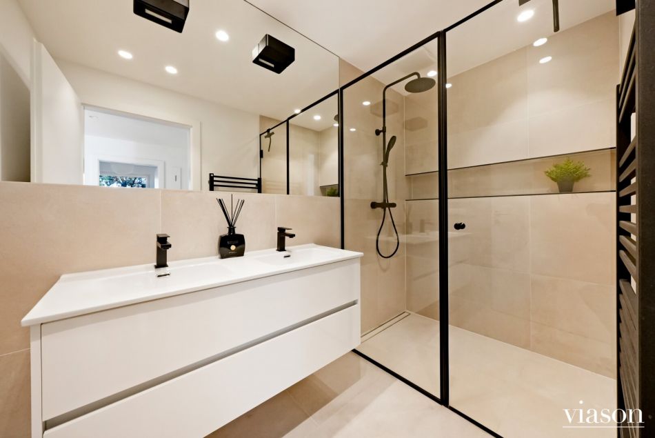 ein saniertes Badezimmer mit Dusche und Doppelwaschbecken sowie Handtuchheizkörper,