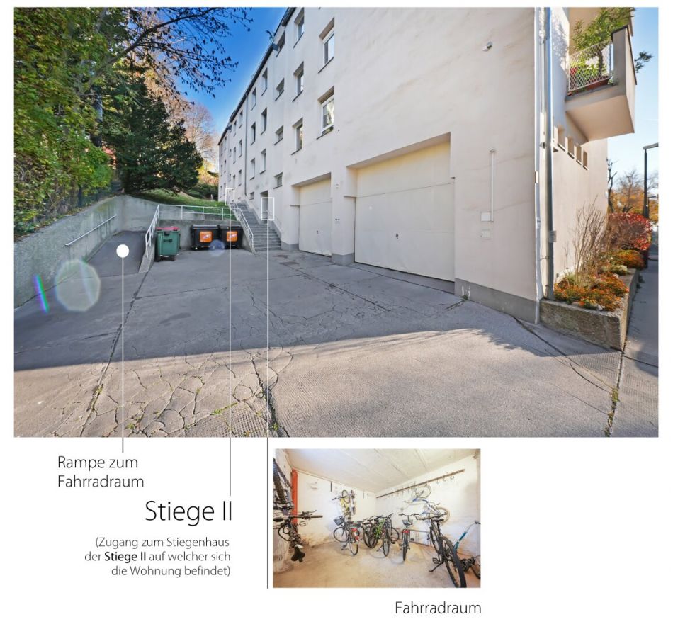 Von der Straße (Paul-Ehrlich-Gasse) führt der Weg über 21 Stufen zur Stiege 2, anschließend gelangt man über ca. 2,5 Stockwerke (43 Stufen) zur Wohnung.