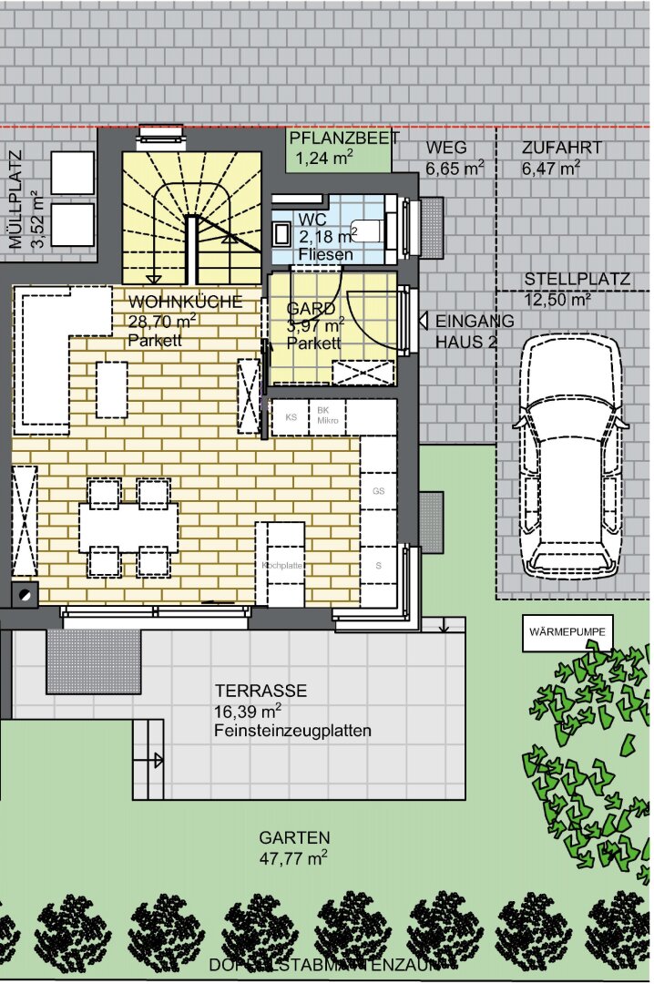 - eine 28,70 m2 große, möblierte Wohnküche mit Ausgang zur 16,39 m2 Terrasse und Garten