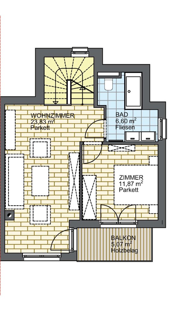 - ein 11,87 m2 großes Schlafzimmer mit Zugang zum 5,07 m2 großen Balkon