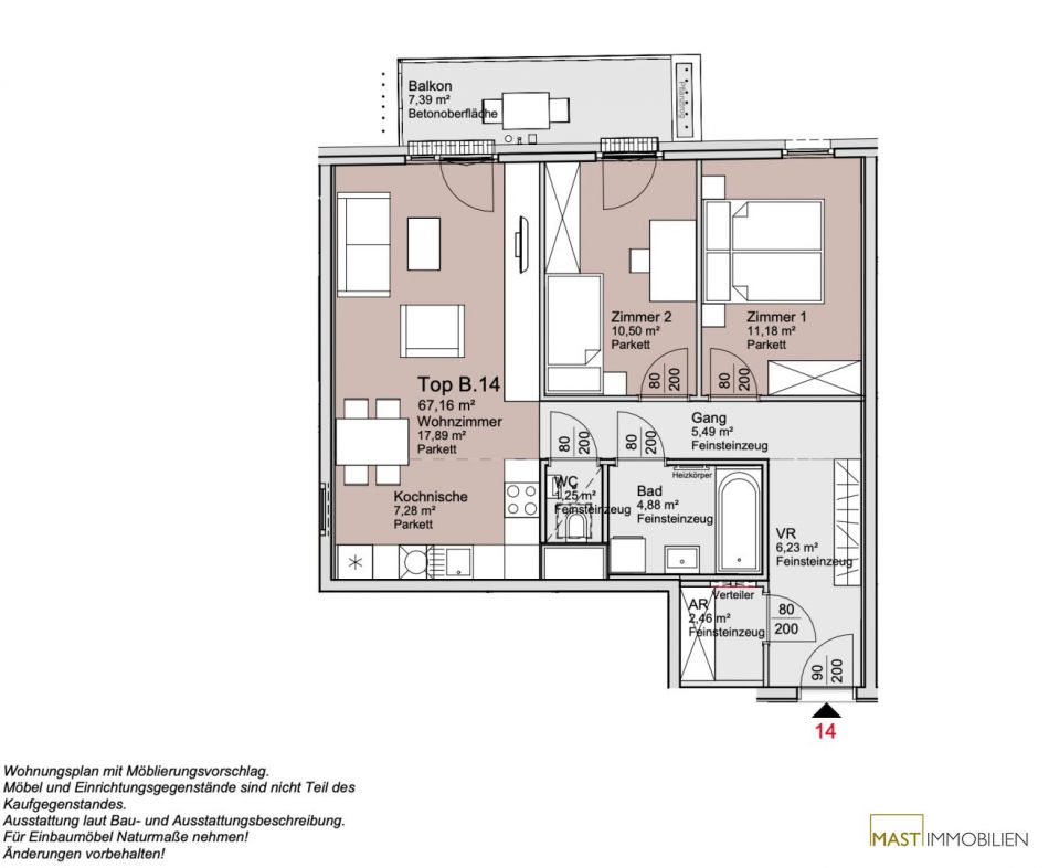 Die Wohnung befindet sich im 2. Liftstock und verfügt über 67,16 m² Wohnfläche + einen 7,39 m² großen Balkon.