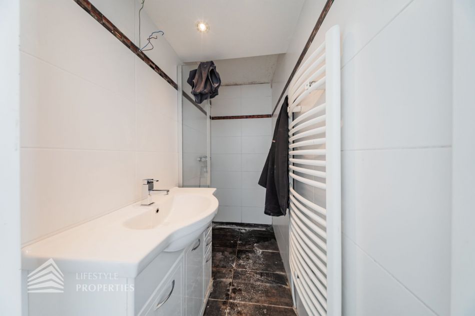 Sie betreten die Immobilie, rechter Hand befindet sich die Küche inkl. Vorraum, die Kücheninstallationen müssen erneuert werden. Links neben der Eingangstür befindet sich ein separates WC, über das Vorzimmer gelangen Sie in ein großes Wohn/Esszimmer, über welches Sie zum Bad inkl. Dusche gelangen.
