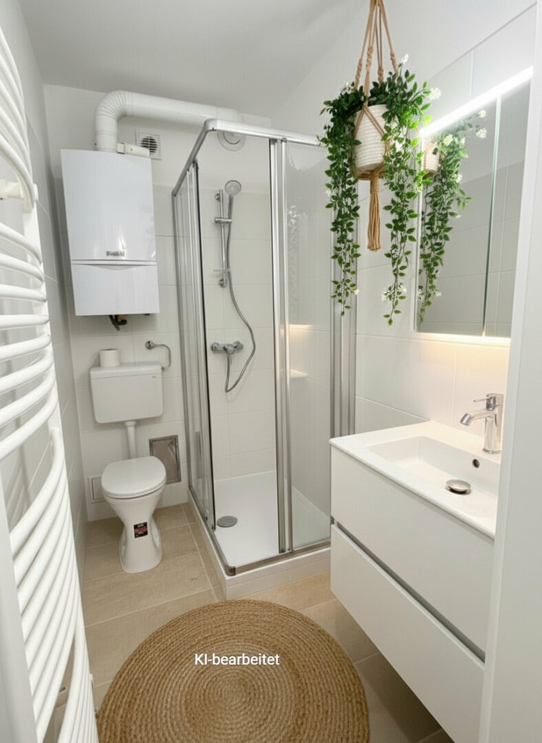 frisch saniertes Duschbad – mit Toilette, Waschtisch und Spiegelschrank