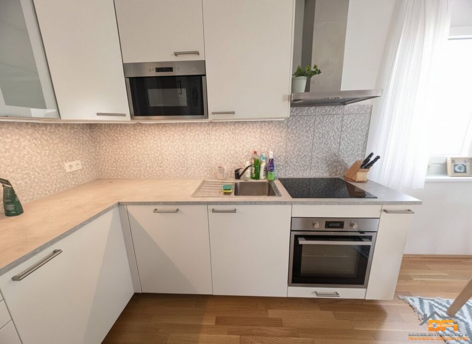 Die Küche ist eine moderne Regina-Einbauküche mit allen notwendigen Einbaugeräten (Herd samt Ceranfeld, Geschirrspüler, Dunstabzug sowie Kühlschrank/Gefrierfach).