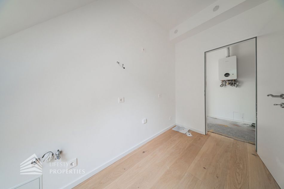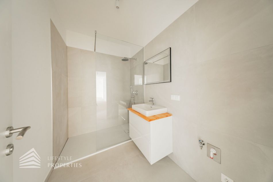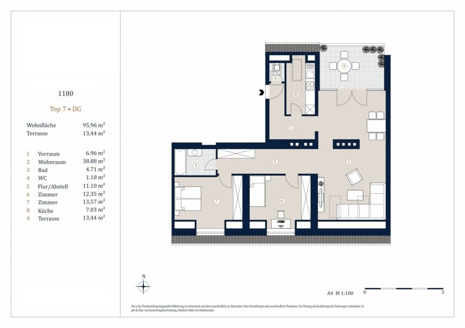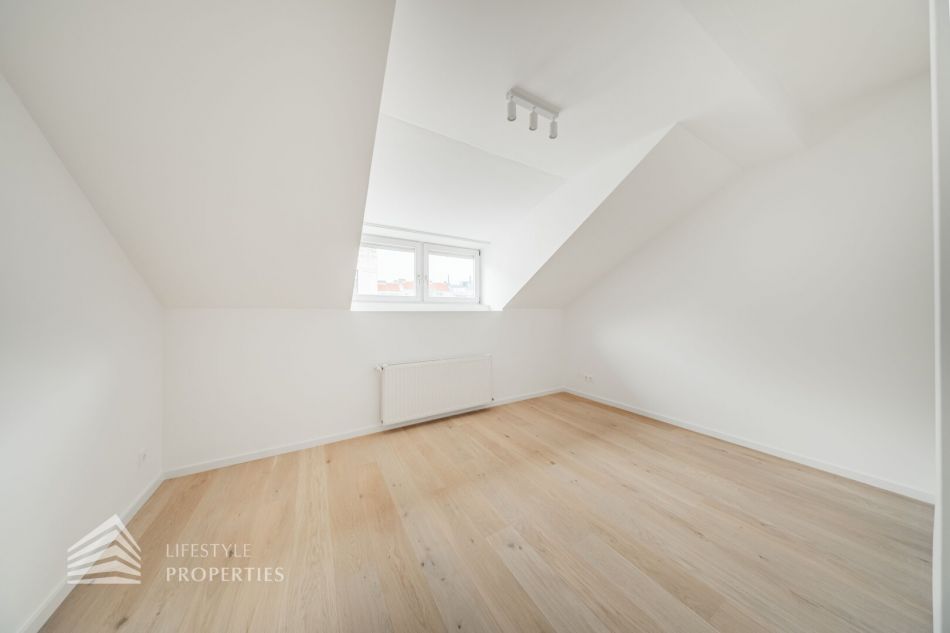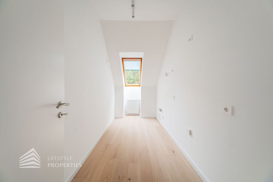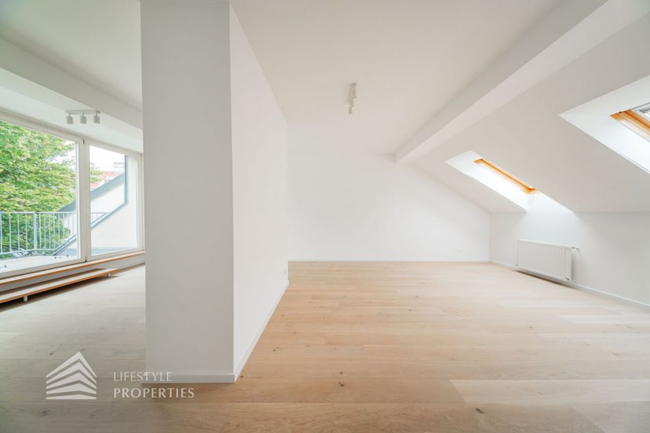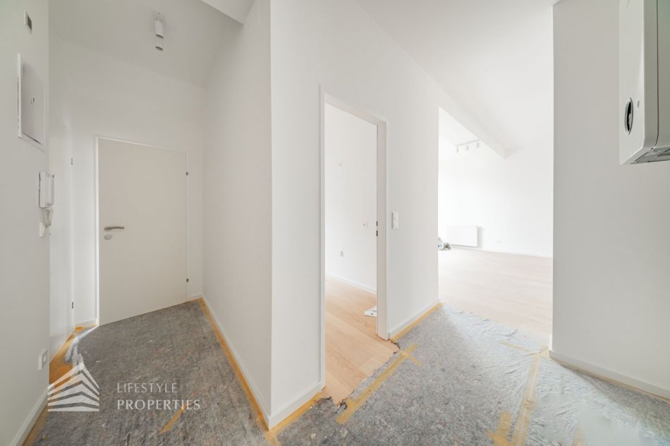 Bei Betreten der Wohnung gelangen Sie in den großzügigen Vorraum, an der Küche vorbei, gelangen Sie nahtlos in das offen gestaltete ca. 39 m² große Wohnzimmer mit Zugang zur Terrasse. Eine Mauer im Wohnraum schafft eine gedankliche Raumtrennung zwischen Ess- und Wohnbereich. Die schrägen Dachfenster sorgen für viel natürliches Tageslicht, den ganzen Tag über. Vom Wohnraum aus gelangen Sie über einen Gang zu den zwei ca. 13 m² großen Schlafzimmern. Am Ende des Ganges befindet sich das Badezimmer. Das separate WC befindet sich direkt beim Eingang.