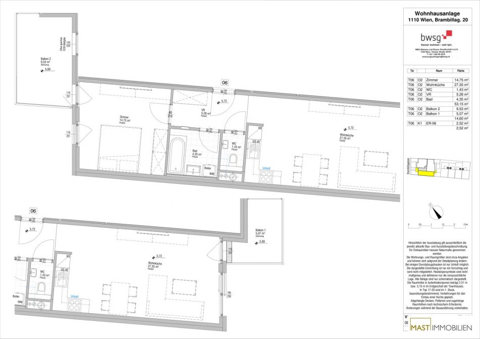 Die Wohnung befindet sich im 2. Liftstock und verfügt über 53,15 m² Wohnfläche + einen 9,53 m² und einen 5,07 m² großen Balkon.