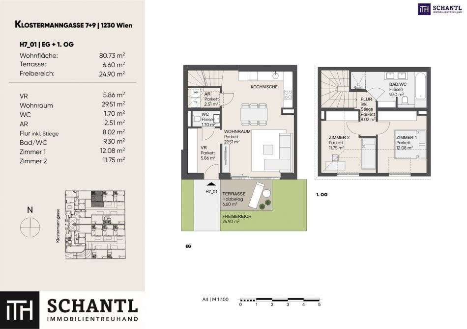Wohnfläche: ca. 80,84m² + Terrasse: ca. 6,6m² + Eigengarten: ca. 24,90m² + Kellerabteil: ca. 10,35m²