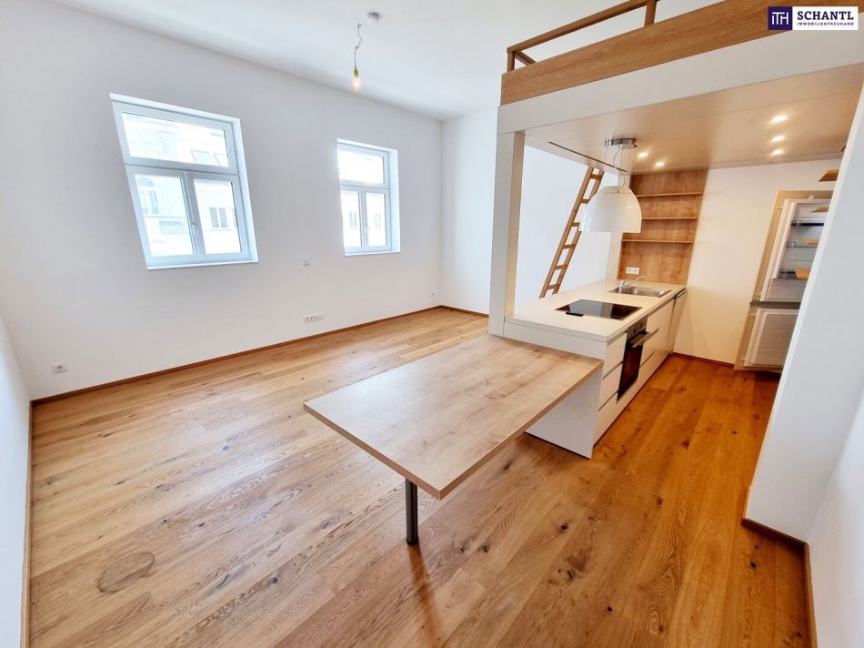 Ihre neue Wohnung wird Sie restlos begeistern und teilt sich in einen geräumigen Vorraum mit Platz für eine Garderobe und eine perfekten Bereich, den man als Stauraum/Schrankraum nutzen kann, ein stylisches Badezimmer mit Dusche und WC, einen praktischen Abstellraum mit Waschmaschinenanschluss und Luftwärmepumpe, sowie ein heller großer Wohn-Essbereich mit voll ausgestatteter Einbauküche und einem raffiniertem Schlafplatz nahe den Sternen...