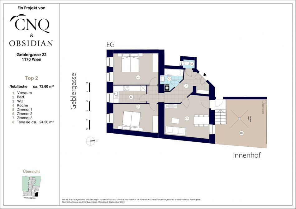 Die Wohnung befindet sich im Erdgeschoss eines klassischen Altbaus und bietet eine Wohnfläche von rund 72,60 m² und zusätzlich eine Terrasse von ca. 24,26 m². Sie ist südseitig zur Geblergasse sowie nordseitig zum Innenhof ausgerichtet. Das Wohnzimmer bietet einen direkten Zugang zur Terrasse im Innenhof, die über wenige Stufen erreichbar ist und einen angenehmen Rückzugsort im Freien darstellt.