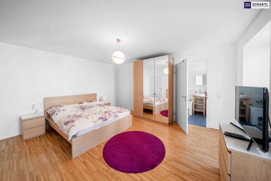 Über eine innenliegende Treppe erreicht man die obere Ebene der Wohnung, wo sich der private Rückzugsbereich befindet. Hier erwartet Sie ein sehr geräumiges Schlafzimmer mit ausreichend Platz für Doppelbett und große Kleiderschränke.