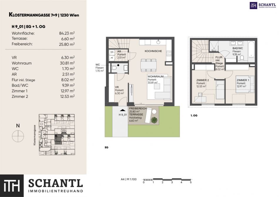Wohnfläche: ca. 84,23m² + Terrasse: ca. 6,6m² + Eigengarten: ca. 25,80m² + Kellerabteil: ca. 6,09m²