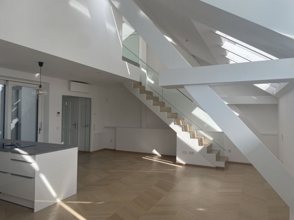Die Maisonetten-Wohnung besticht neben ihrer raffinierten und modernen Gestaltung ebenfalls mit der zentralen Lage im Herzen von Wien! Die Zugänge innerhalb der Wohnung erfolgen teilweise zentral, wobei Sie direkt im Vorzimmer von einem Abstellraum mit Waschmaschinenanschluss und einem großzügigen Garderobenbereich empfangen werden. Von hier aus gelangen Sie direkt hindurch durch die Wohnküche auf die Terrasse, welche zum Entspannen einlädt. Ein separates Gäste-WC neben dem Eingang, komplettieren diesen Bereich.