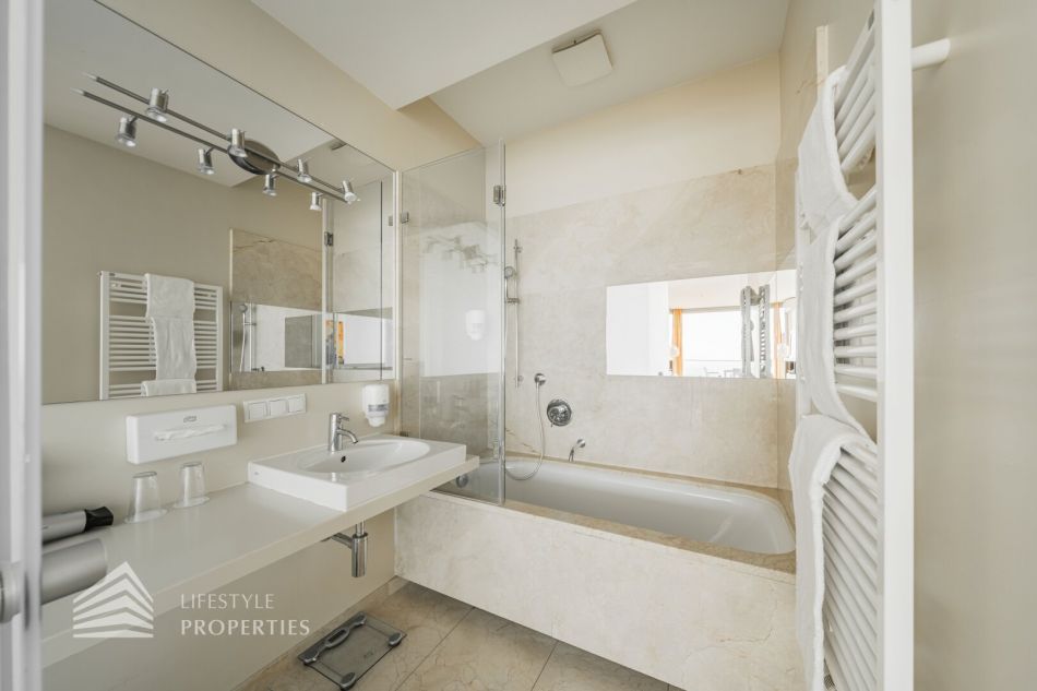 Zur Vermietung gelangt eine lichtdurchflutete Garconniere am Kahlenberg mit atemberaubender Aussicht über Wien.Die helle Wohnung befindet sich in einem im Jahr 2006 errichteten, modernen Wohngebäude im 1. Untergeschoss und ist bequem über einen Personenaufzug erreichbar. Die Wohnfläche von ca. 67,77 m² erstreckt sich über einen Vorraum, einen großzügigen Wohnraum, ein Badezimmer, ein separates WC sowie einen Abstellraum. Die Haupträume der Wohnung sind mit hochwertigem Parkett ausgekleidet, in den Nassräumen sind moderne Fliesen aus Marmor verlegt. Das Highlight der Immobilie ist die großflächige ca. 21,46 m² große Terrasse, welche einen wunderschönen Blick auf Wien garantiert. Hier haben Sie ausreichend Platz, um Ihre eigene Wohlfühloase im Freien zu errichten. Das Badezimmer ist mit einer Badewanne und einem Waschtisch ausgestattet ist. In das separate WC und den Abstellraum gelangen Sie über den Vorraum.