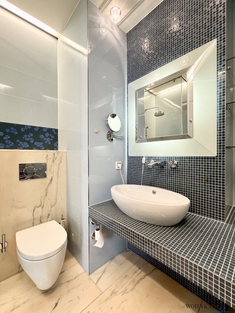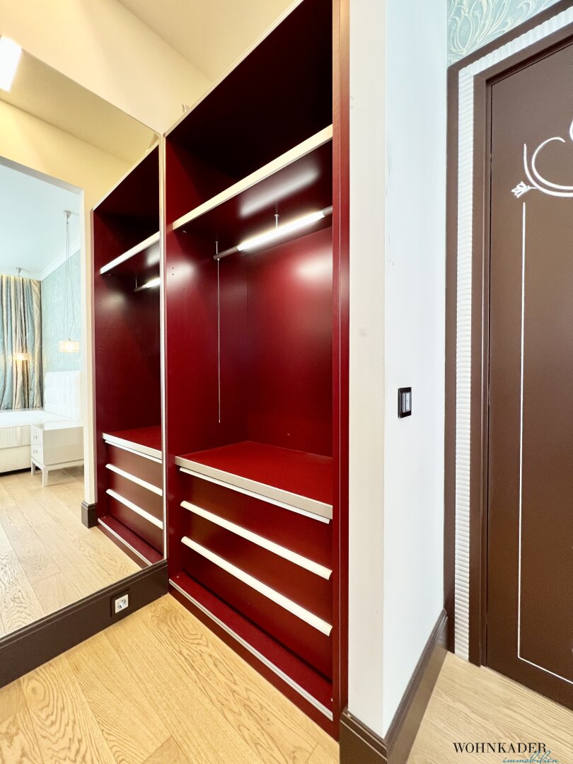 Das Vorzimmer überrascht mit einer großzügigen, begehbaren Garderobe. Eines der stilvollen Badezimmer ist mit Dusche, WC und Handwaschbecken ausgestattet, während das zweite Bad mit Whirlpoolwanne, Waschtisch und einem opulenten Kronleuchter aus echtem Murano-Glas für ein Spa-Erlebnis der Extraklasse sorgt.