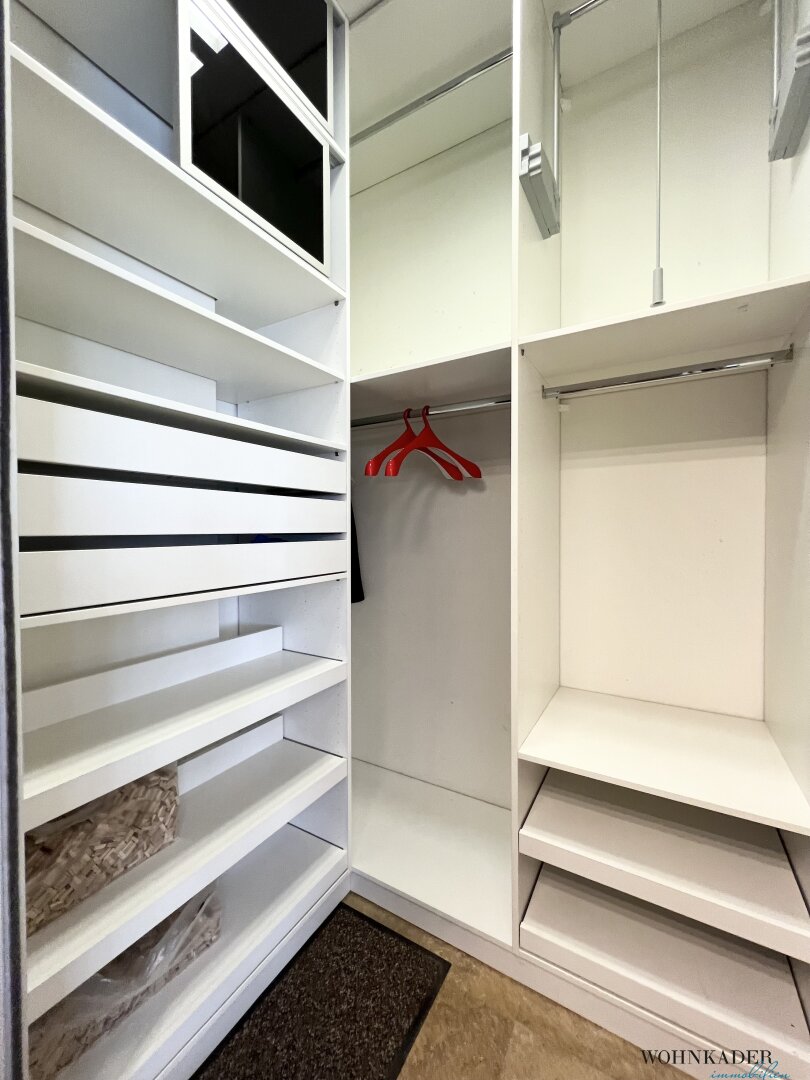 To the left, a corridor leads you into the private section of the apartment. On the left-hand side, there is a bathroom equipped with a shower, washbasin, and toilet. Next to it is a practical utility room with a washing machine, a large built-in cabinet, and ample storage space for household items such as an ironing board, drying rack, etc.