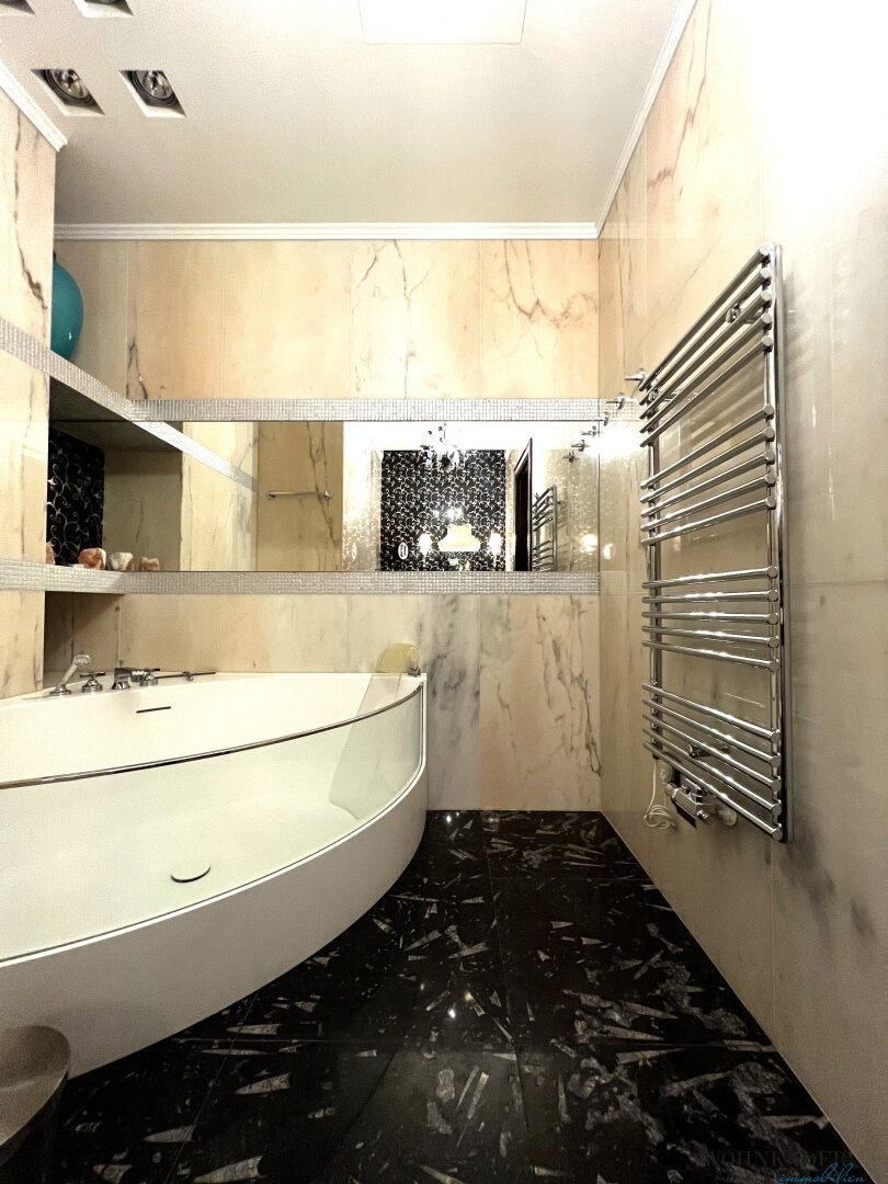 В прихожей расположена просторная гардеробная. Один из санузлов оборудован душем, унитазом и умывальником. Во второй ванной — джакузи, элегантная раковина с зеркалом из муранского стекла и роскошная люстра из оригинального муранского стекла, свисающая с потолка.