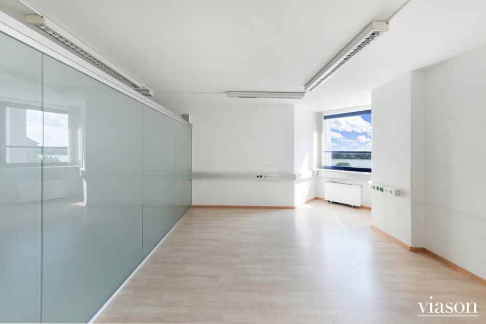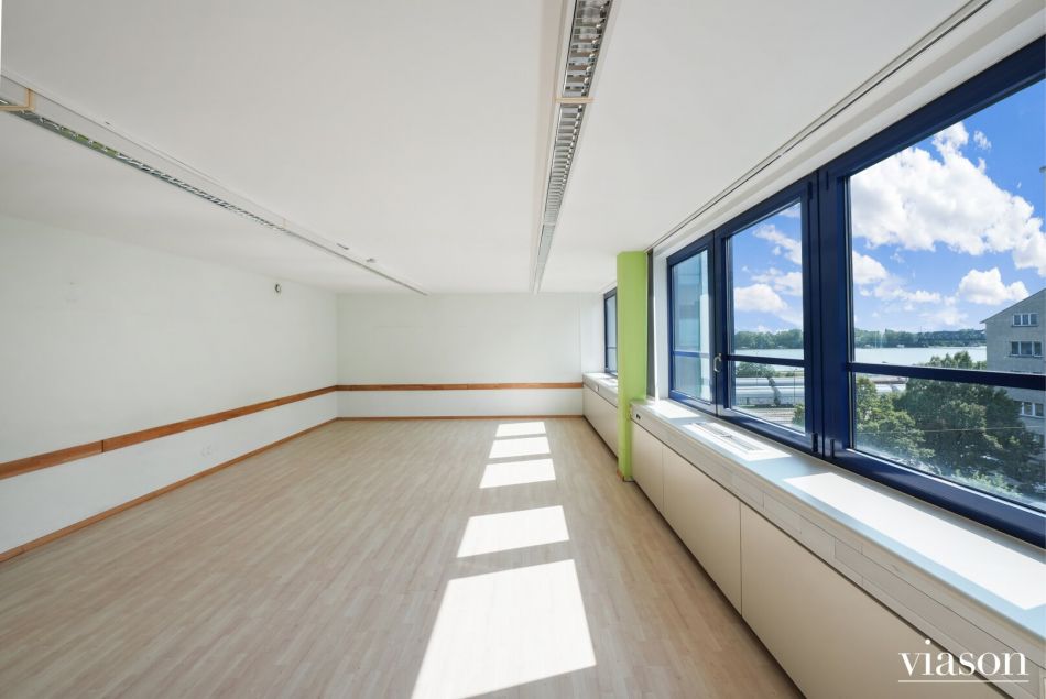 Es bietet 8 ZIMMER wobei 4 Zimmer Richtung Donau (teilweise seitlicher Blick) blicken. Das Büro ist mit Laminatböden und Fliesen in den Sanitärräumen ausgestattet. Eine Teeküche ohne Küchengeräte ist ebenso vorhanden.