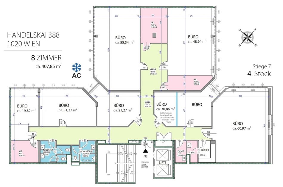 4. OG - ca. 407,85 m² - EUR 10,80 pro m². Ab sofort. Befristung: 31.12.2028. Brutto EUR 7.620,26