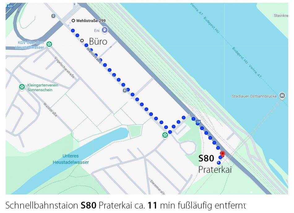 ÖFFENTLICHER VERKEHR: U2 „Donaumarina“ ist in ca. 6 min fußläufig erreichbar, Bushaltestelle direkt vor dem Haus: BUS 77A, 79A, 79B. Die Schnellbahnstation Prater Kai S-Bahnlinie S80 ist in ca. 11 min fußläufig erreichbar.