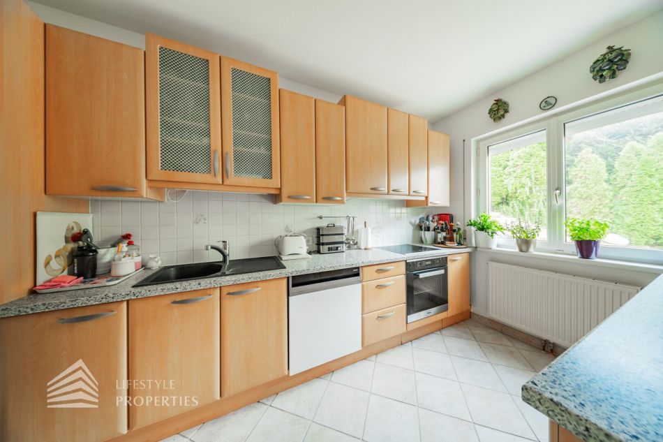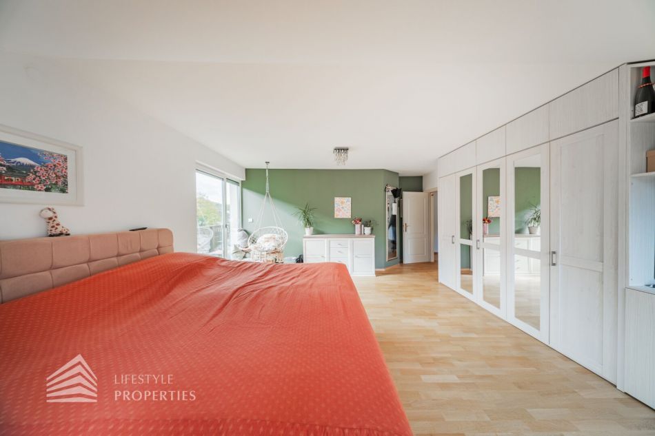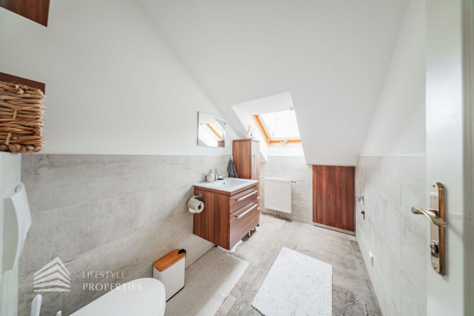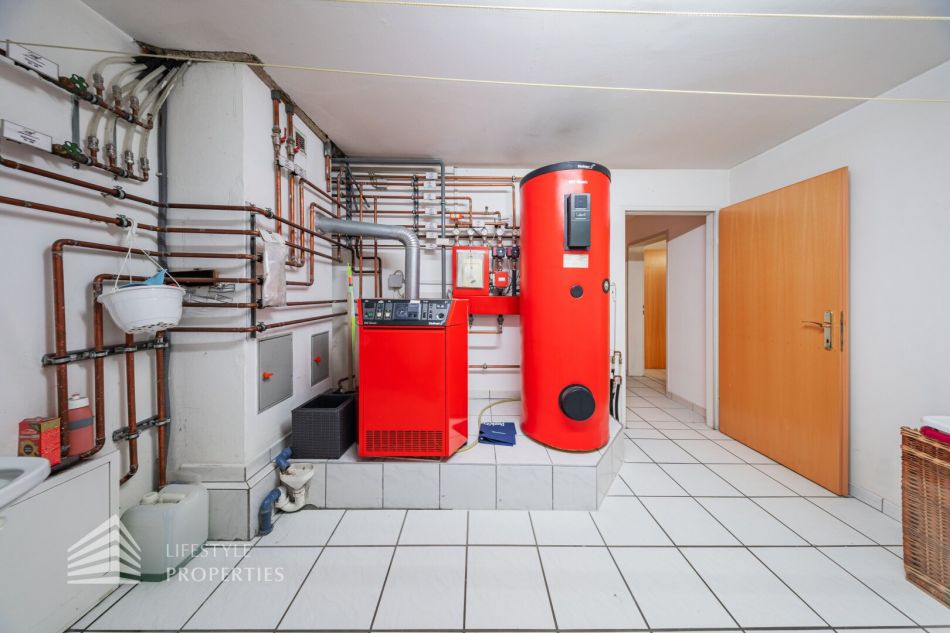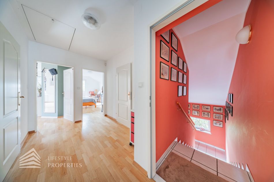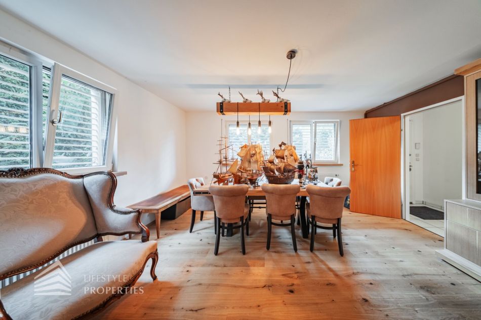 Die Villa mit einer Nutzfläche von ca. 348 m² vereint Luxus, Natur und Flexibilität auf einzigartige Weise. Eingebettet in ein ruhiges Grundstück von über ca. 1.098 m², bietet sie großzügige Räume, maßgefertigte Einbaumöbel, modernste Technik und absolute Privatsphäre, ein Zuhause, das höchsten Wohnkomfort und eleganten Lebensstil harmonisch verbindet. Das Haus unterteilt sich ein Kellergeschoss, ein Erdgeschoss und ein Dachgeschoss und bietet 7 Zimmer, 3 Bäder, 2 Küchen, eine Garage, einen Haustechnikraum, Kellerräume sowie mehrer Abstellräume. Technisch überzeugt die Villa durch eine Gasheizung kombiniert mit Fußbodenheizung und Radiatoren, einen 200-Liter-Warmwasserspeicher, hochwertige Internorm-Fenster, ergänzt durch Velux-Dachfenster, elektrische Außenrollläden an den Terrassentüren und manuelle Rollos an den übrigen Fenstern. Eine Alarmanlage schützt das gesamte Haus. Maßgefertigte Einbaumöbel nach Wunsch sind im Kaufpreis enthalten; ein Teil des weiteren hochwertigen Inventars kann ebenfalls übernommen werden. Die hochwertigen Böden aus Parkett, Fliesen und Naturstein verleihen dem Haus zeitlose Eleganz.