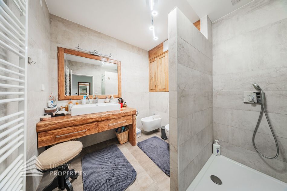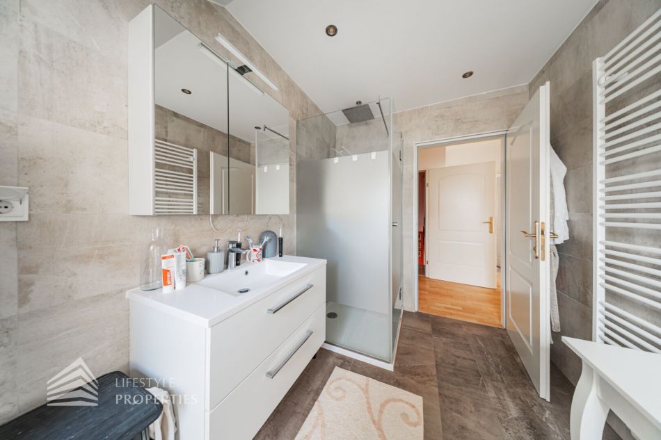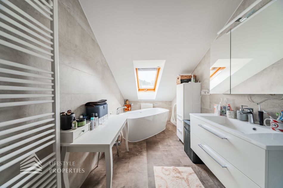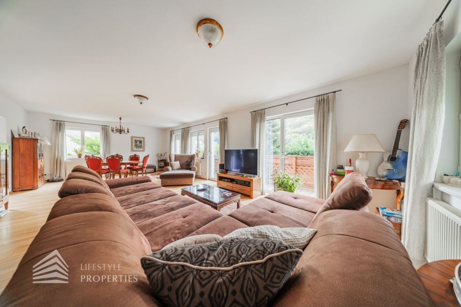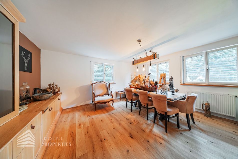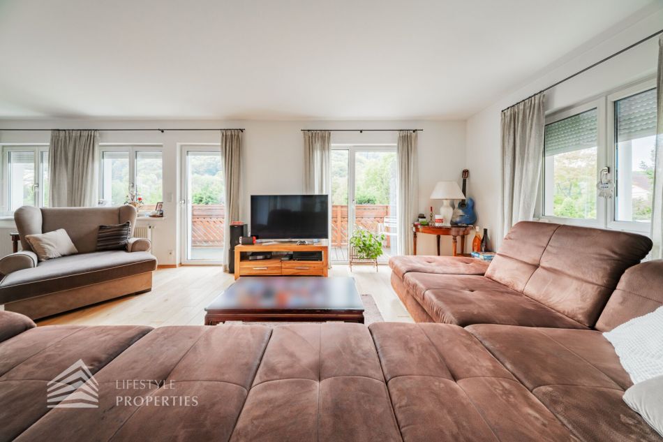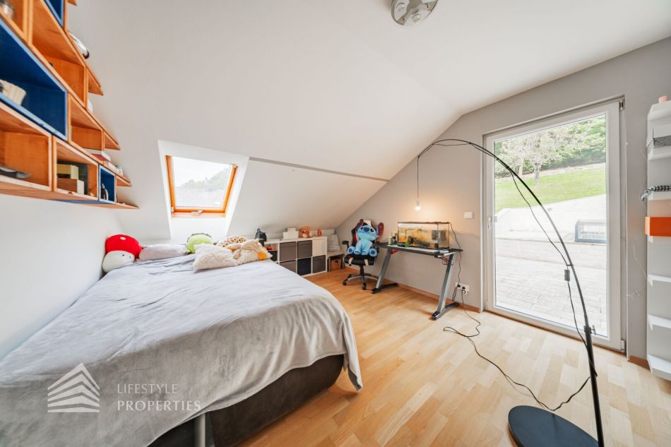 Die Villa mit einer Nutzfläche von ca. 348 m² vereint Luxus, Natur und Flexibilität auf einzigartige Weise. Eingebettet in ein ruhiges Grundstück von über ca. 1.098 m², bietet sie großzügige Räume, maßgefertigte Einbaumöbel, modernste Technik und absolute Privatsphäre, ein Zuhause, das höchsten Wohnkomfort und eleganten Lebensstil harmonisch verbindet. Das Haus unterteilt sich ein Kellergeschoss, ein Erdgeschoss und ein Dachgeschoss und bietet 7 Zimmer, 3 Bäder, 2 Küchen, eine Garage, einen Haustechnikraum, Kellerräume sowie mehrer Abstellräume. Technisch überzeugt die Villa durch eine Gasheizung kombiniert mit Fußbodenheizung und Radiatoren, einen 200-Liter-Warmwasserspeicher, hochwertige Internorm-Fenster, ergänzt durch Velux-Dachfenster, elektrische Außenrollläden an den Terrassentüren und manuelle Rollos an den übrigen Fenstern. Eine Alarmanlage schützt das gesamte Haus. Maßgefertigte Einbaumöbel nach Wunsch sind im Kaufpreis enthalten; ein Teil des weiteren hochwertigen Inventars kann ebenfalls übernommen werden. Die hochwertigen Böden aus Parkett, Fliesen und Naturstein verleihen dem Haus zeitlose Eleganz.