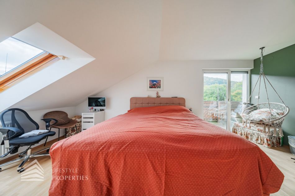 Im Obergeschoss befinden sich drei helle Schlafzimmer, zwei davon mit Zugang zu einer Terrasse, das dritte mit Zugang zum Balkon. Eine der Terrassen bietet einen traumhaften Blick auf den gepflegten Garten und den Waldrand. Ein großflächiges Wohnzimmer, ebenfalls mit Zugang zum Balkon, ist ebenso auf dem Geschoss zu finden. Ein zentrales Badezimmer, ein separates WC mit Fenster und mit Waschmaschinenanschluss, eine kleine Küche und eine Speisekammer bieten zusätzlichen Komfort für Familien oder Gäste.