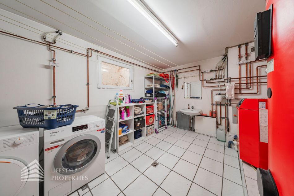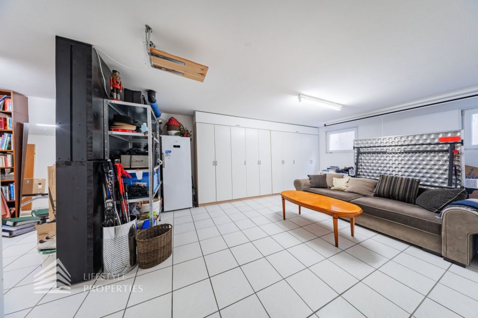 Im Untergeschoss befinden sich eine Garage mit elektrischem Tor und direktem Zugang ins Haus, ein großzügiger Partyraum, ein teilweise abgetrennter Fitnessbereich sowie ein behaglicher Raum mit stilvollem Ambiente – ideal zum Entspannen, für private Momente oder auch als Cigar-Lounge nutzbar. Zusätzlich ist ein vorbereiteter Raum für eine Sauna mit vorhandenem Abgasanschluss vorhanden, ergänzt durch ein Duschbad und ein separates WC. Drei Abstellräume sowie ein Heiz- und Technikraum mit integriertem Waschbereich runden diese Ebene ab. Über eine Sicherheitstür führt der Ausgang direkt auf Straßenniveau in den Eingangsbereich des Grundstücks.