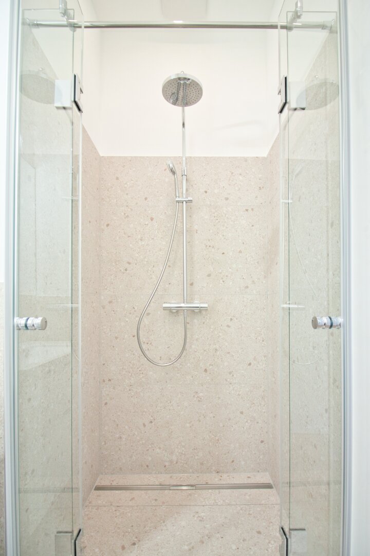 Der großzügige Vorraum bietet ausreichend Platz für Garderobe, die Gastherme und für eine Waschmaschine. Direkt neben dem Eingang befindet sich ein separates WC mit Handwaschbecken. Das ostseitige Schlafzimmer verfügt über ein Badezimmer-en-suite mit bodengleicher Regenwalddusche, Waschtisch mit Unterschrank und einem elektrischen Handtuchheizkörper, das über eine elegante Schiebetüre zugänglich ist.