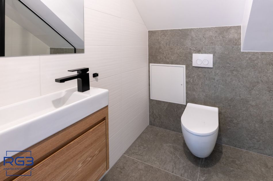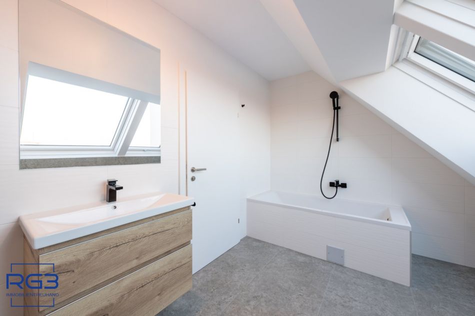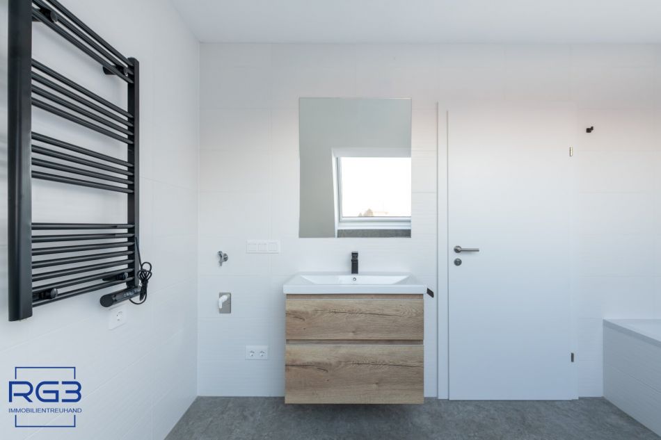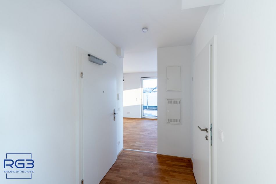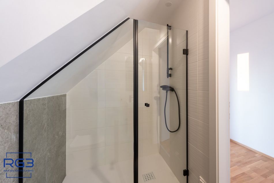 Mit dem Lift fahren Sie bequem in den ersten Stock. Sie betreten die Wohnung und spüren sofort: alles ist neu, alles ist ruhig, alles passt zusammen. Rechts befindet sich ausreichend Platz für Garderobe und Jacken. Links liegt das moderne Badezimmer mit extra Toilette, klar gestaltet, hochwertig ausgeführt.