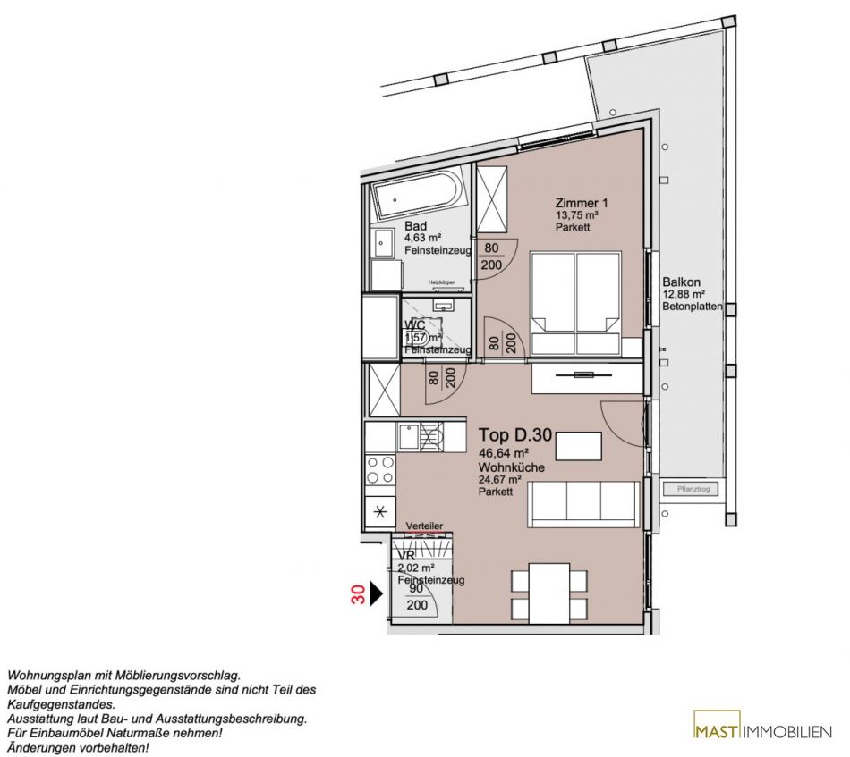 Die Wohnung befindet sich im 4. Liftstock und verfügt über 46,64 m² Wohnfläche + einen 12,88 m² großen Balkon.