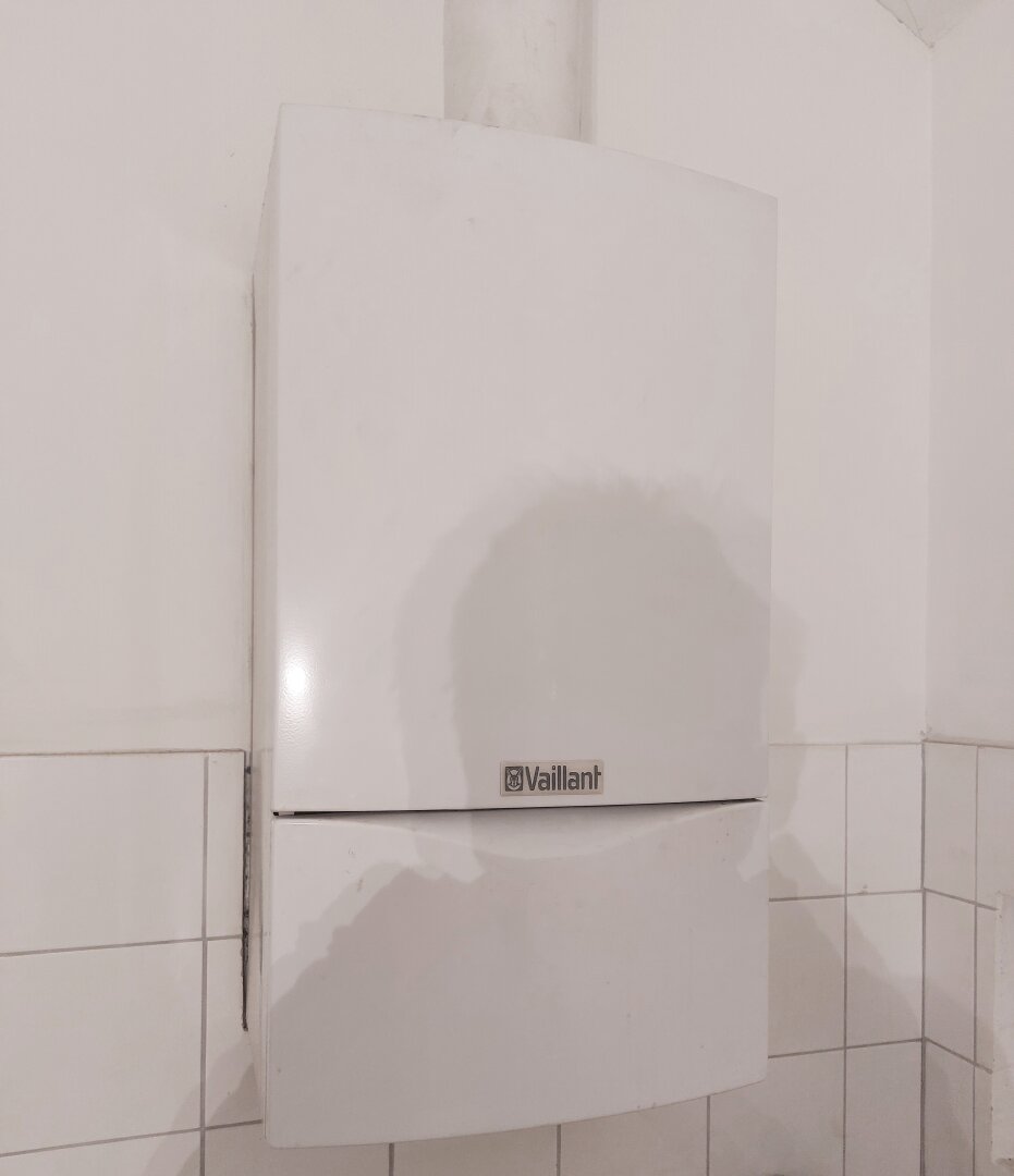 Gasetagenheizung mit VAILLANT-Therme. Zusätzlich gibt es noch einen historischen weissen Kachelofen.