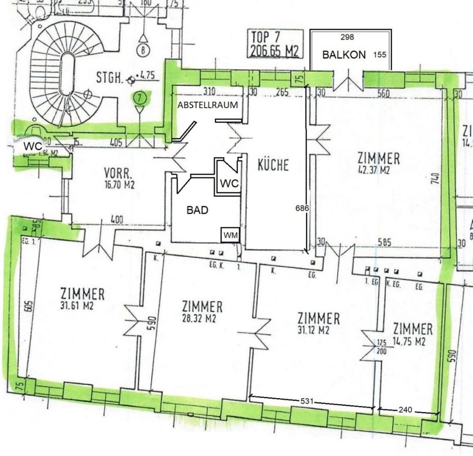 Wenn man sie betritt, steht man im Vorzimmer. Von dort kann man sie im oder gegen den Uhrzeigersinn.begehen So könnte man sie auch recht gut aufteilen und einen Teil zum Wohnen nützen und den anderen Teil als Büro für Geschäftszwecke oder Praxis.