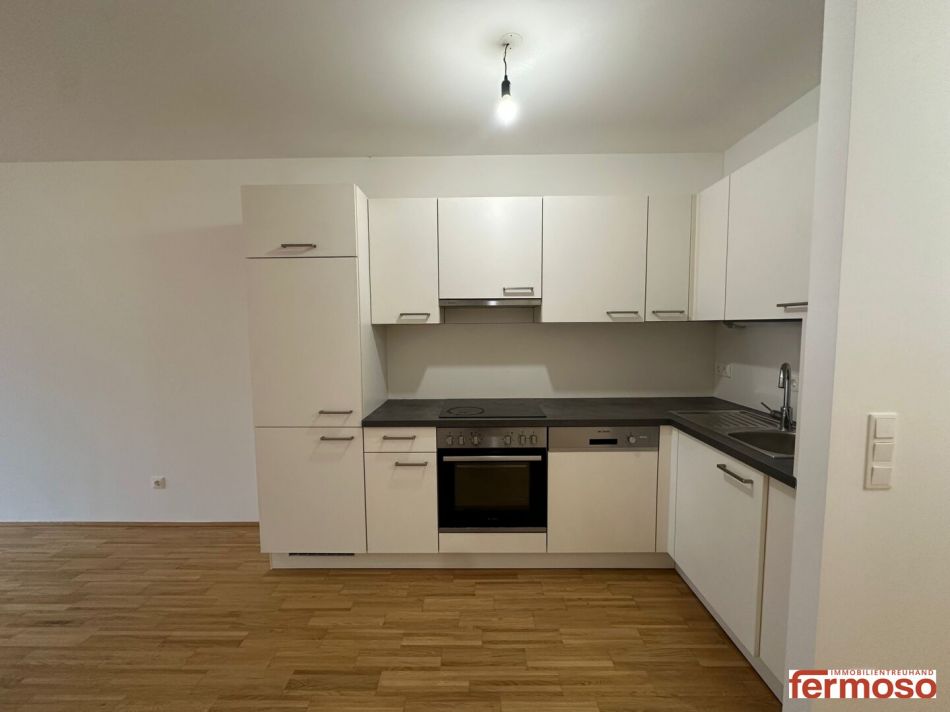 Die moderne Küche ist funktional gestaltet und mit hochwertigen Geräten ausgestattet. Sie bietet ausreichend Platz zum Kochen und fügt sich harmonisch in das Gesamtbild der Wohnung ein.