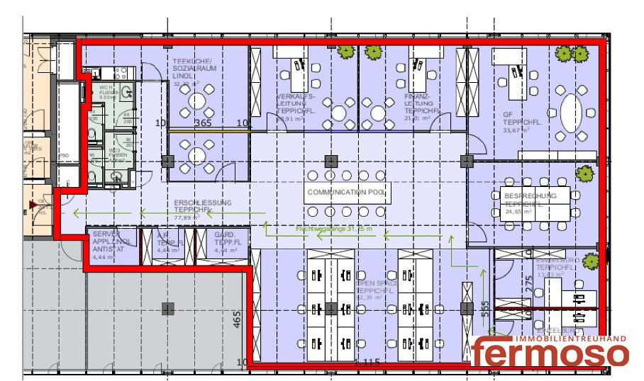 Die großzügige Bürofläche verfügt über separate Pausenräume und eine Teeküche. Mittig befindet sich ein offener Bereich, die Büroräume sind ca. 20 - 40 qm groß.