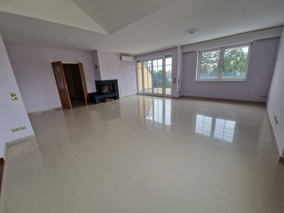traumhafter loftartiger Wohnraum mit Kamin und Ausgang auf die schöne große Terrasse und Grünblick