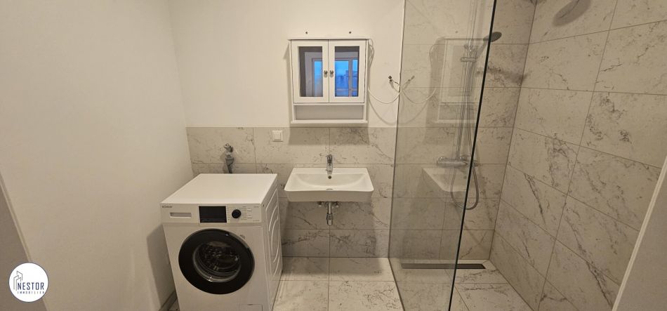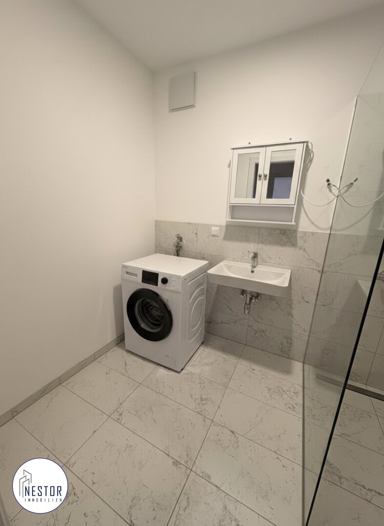 - Badezimmer: Modern ausgestattetes Badezimmer (ca. 4,66 m²) mit Dusche, Waschbecken, Handtuchheizkörper und Waschmaschine.
