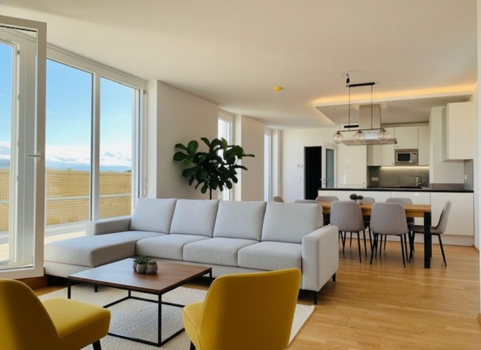 Ob kleine Familie, Paar oder anspruchsvoller Single – der durchdachte Grundriss mit drei großzügigen, hellen Zimmern schafft Raum für Rückzug und Gemeinschaft gleichermaßen. Der offene Wohn-, Ess- und Küchenbereich mit hochwertiger Komplettküche lädt zum Kochen, Genießen und Verweilen ein. Große Fensterflächen sorgen für eine freundliche, sonnige Atmosphäre und unterstreichen das moderne Wohnambiente.