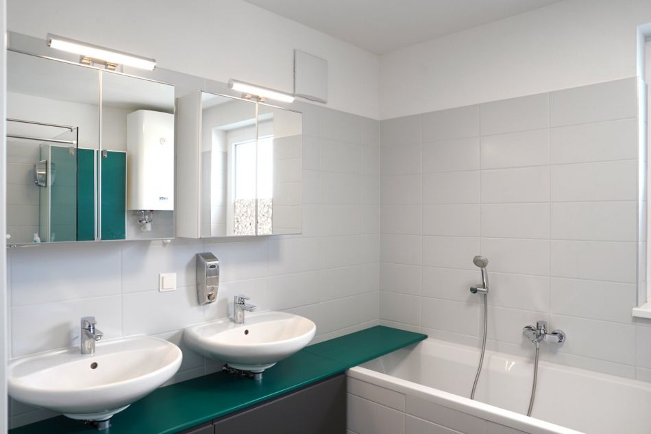Das Badezimmer ist mit einem Doppelwaschbecken, einer Walk-in-Dusche, Waschmaschinenanschluss und Badewanne, sowie einem Fenster ausgestattet.