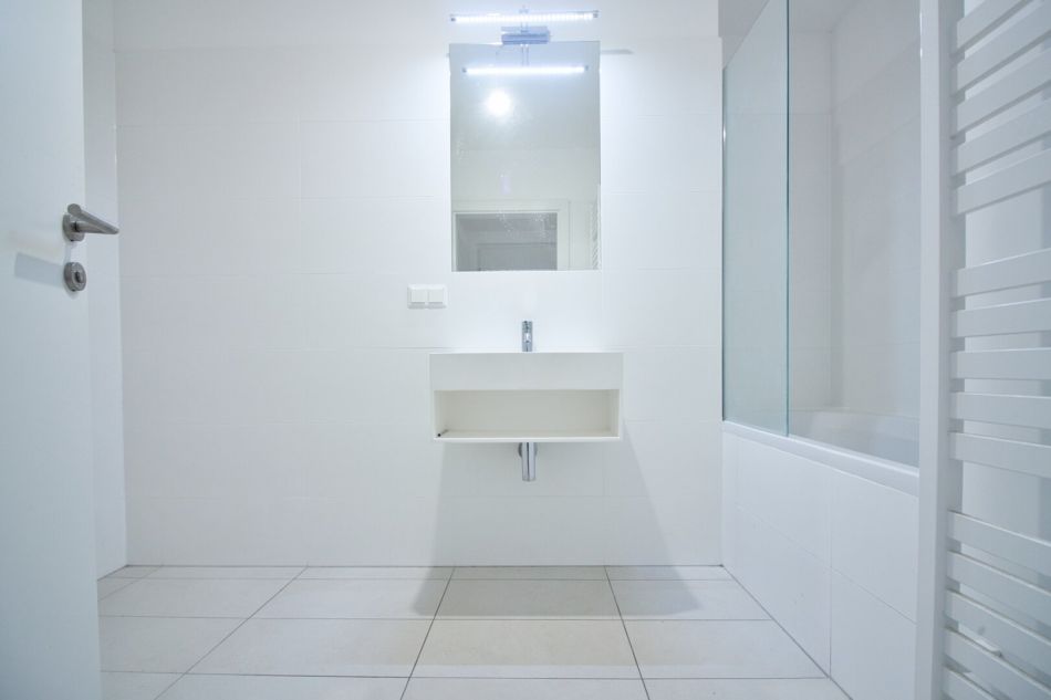 Badezimmer mit Badewanne, Waschbecken, Handtuchheizkörper & Waschmaschinenanschluss