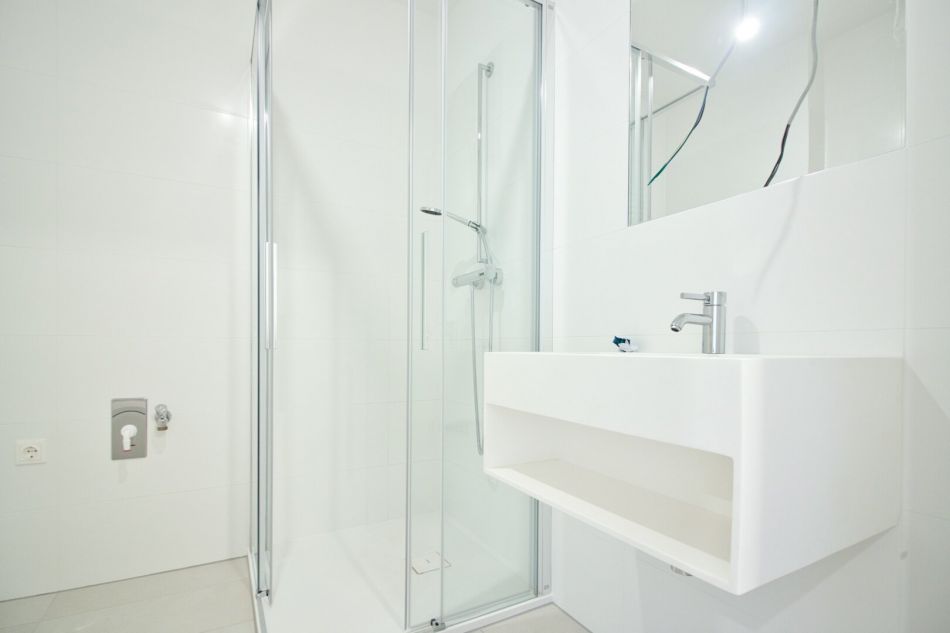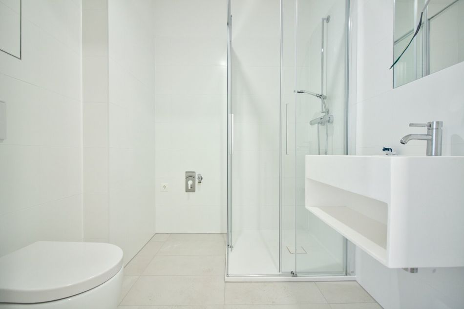 - Badezimmer mit Dusche, WC, Handtuchheizkörper & Waschmaschinenanschluss
